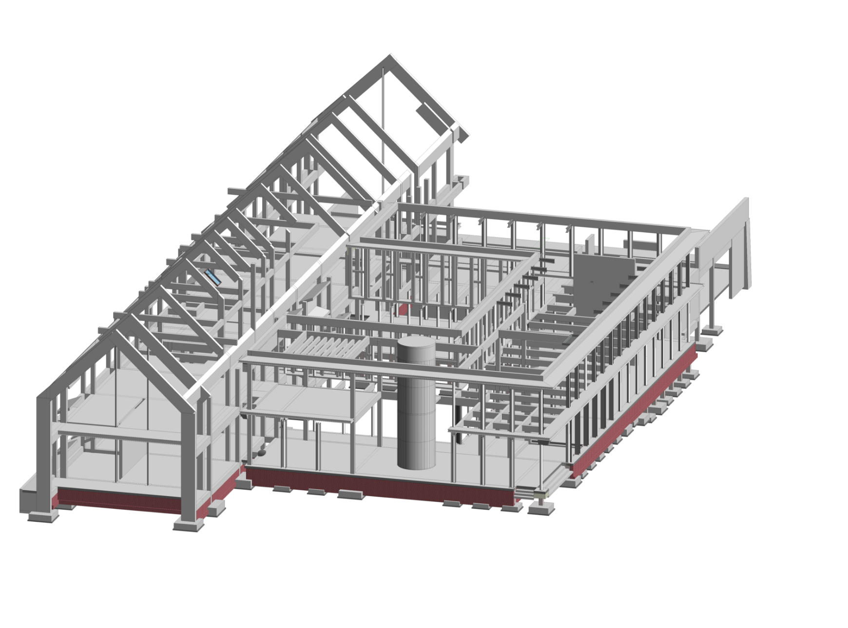 The model is further refined to add generic shape, and approximate size to building elements. Structure, floor slabs, generic fenestration and other elements of architectural detail are added.
